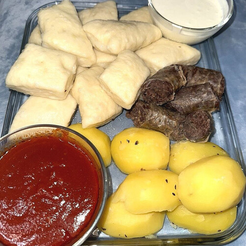 Состав полностью натуральный : мясо полевое горное  (говядина) , говяжьи кишки , лук репчатый , горный тмин .