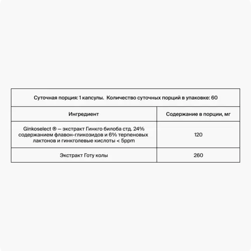 GINKGO BILOBA — — премиальная добавка с экстрактом Ginkgoselect® от итальянского лидера Indena и готу колой высшего качества. Формула создана без вредных наполнителей для максимальной эффективности и безопасности.