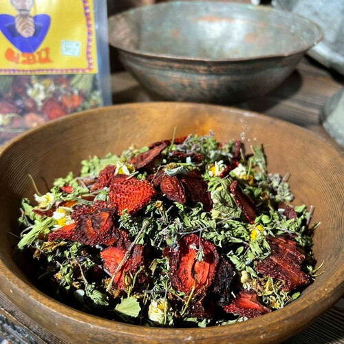Состав: клубника, дробленный шиповник, душица, зверобой, боярышник, чабрец, мята, ромашка, листья смородины.