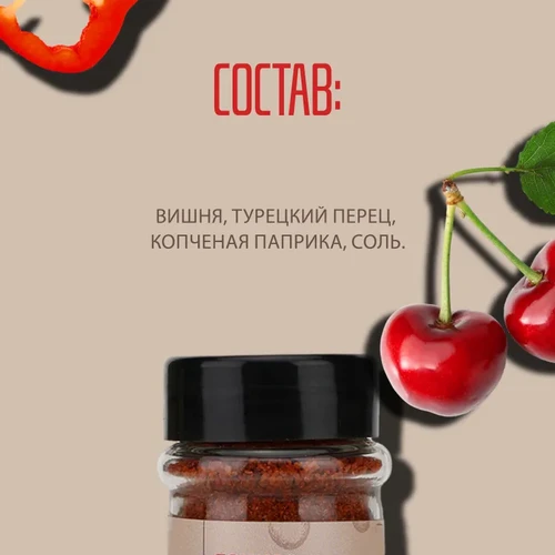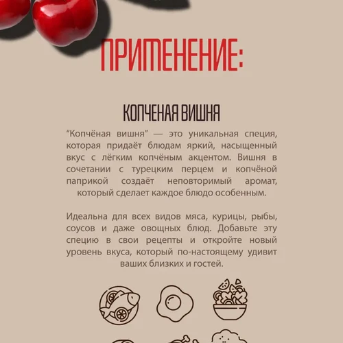 “Копчёная вишня” — это уникальная специя, которая придаёт блюдам яркий, насыщенный вкус с лёгким копчёным акцентом. Вишня в сочетании с турецким перцем и копчёной паприкой создаёт неповторимый аромат, который сделает каждое блюдо особенным.