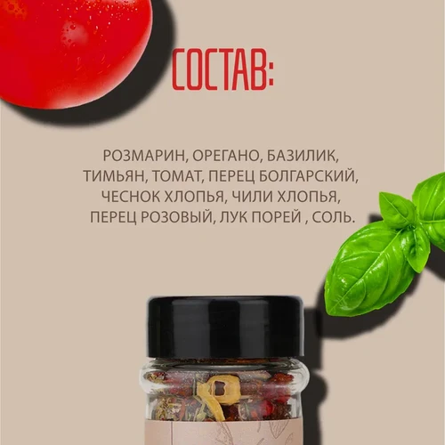 Розмарин, орегано, базилик, тимьян, томат, перец болгарский, чеснок хлопья, чили хлопья, перец розовый, лук порей, соль.