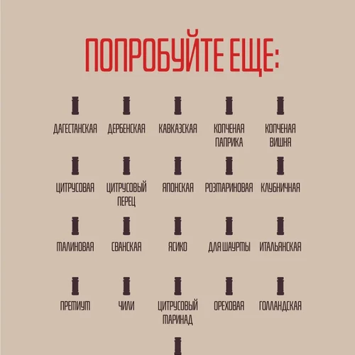 Кинза, укроп, майоран, тимьян, перец черный, паприка, чили, базилик, чеснок, кориандр, хмели, соль.