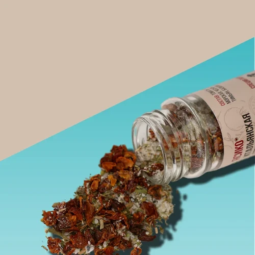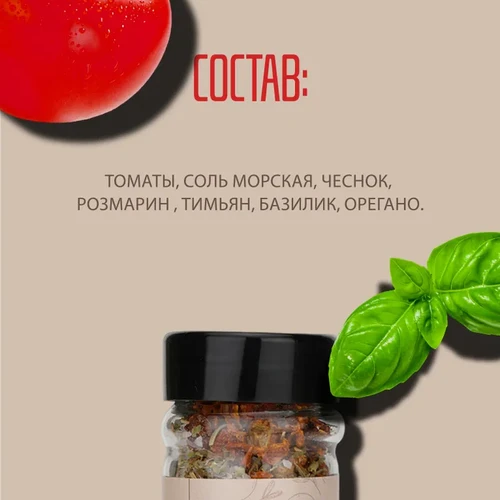 сушеные томаты, ароматные травы и морская соль в одной сбалансированной смеси. Лёгкий пряный акцент и насыщенный аромат делают её универсальной для множества блюд.