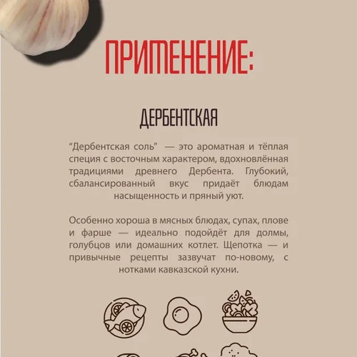 “Дербентская соль” — это ароматная и тёплая специя с восточным характером, вдохновлённая традициями древнего Дербента. Глубокий, сбалансированный вкус придаёт блюдам насыщенность и пряный уют.