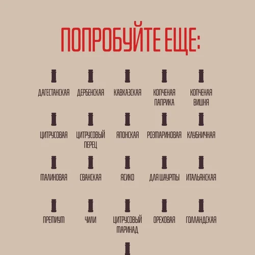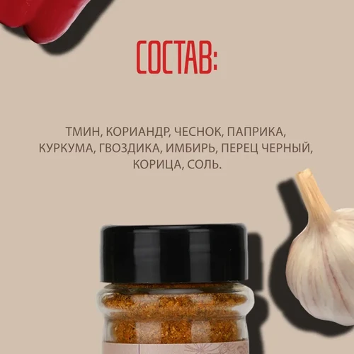 Тмин, кориандр, чеснок, паприка, куркума, гвоздика, имбирь, перец черный, корица, соль.
