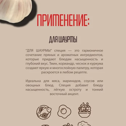 “ДЛЯ ШАУРМЫ” специя — это гармоничное сочетание пряных и ароматных ингредиентов, которые придают блюдам насыщенность и глубокий вкус. Тмин, кориандр, чеснок и куркума создают яркую и многослойную палитру, которая раскроется в любом рецепте.